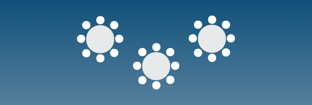 Another large conference room layout, the banquet style is often seen when large conferences that combine entertainment and seated dining. Usually this setup is utilized for award dinners, company holiday parties and other food-and-connect type events.