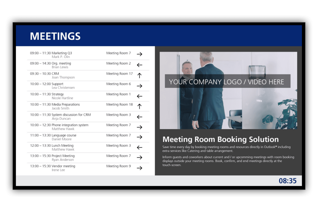 Ariadne integrates with Outlook®, which saves you time because meetings booked in your calendar are automatically displayed on your digital signs.